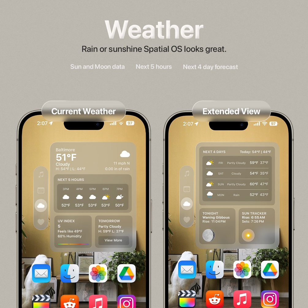 Unlike Vision OS, iOS offers a dedicated dark mode – so does this widget. Each layer follows the Apple Spatial UI Guidelines to enhance legibility, match font weights, ornaments, hierarchy and more.